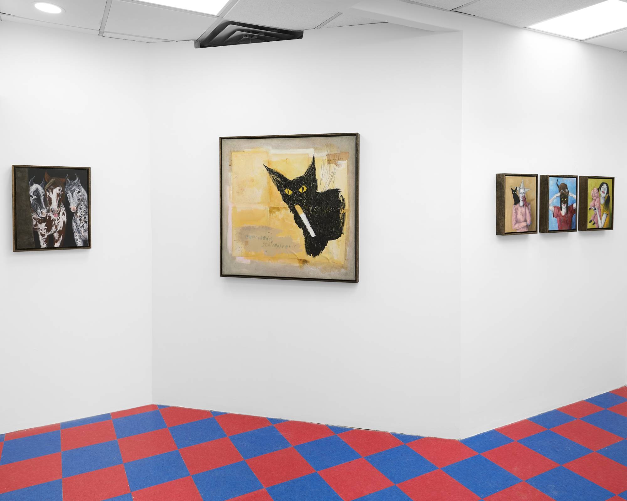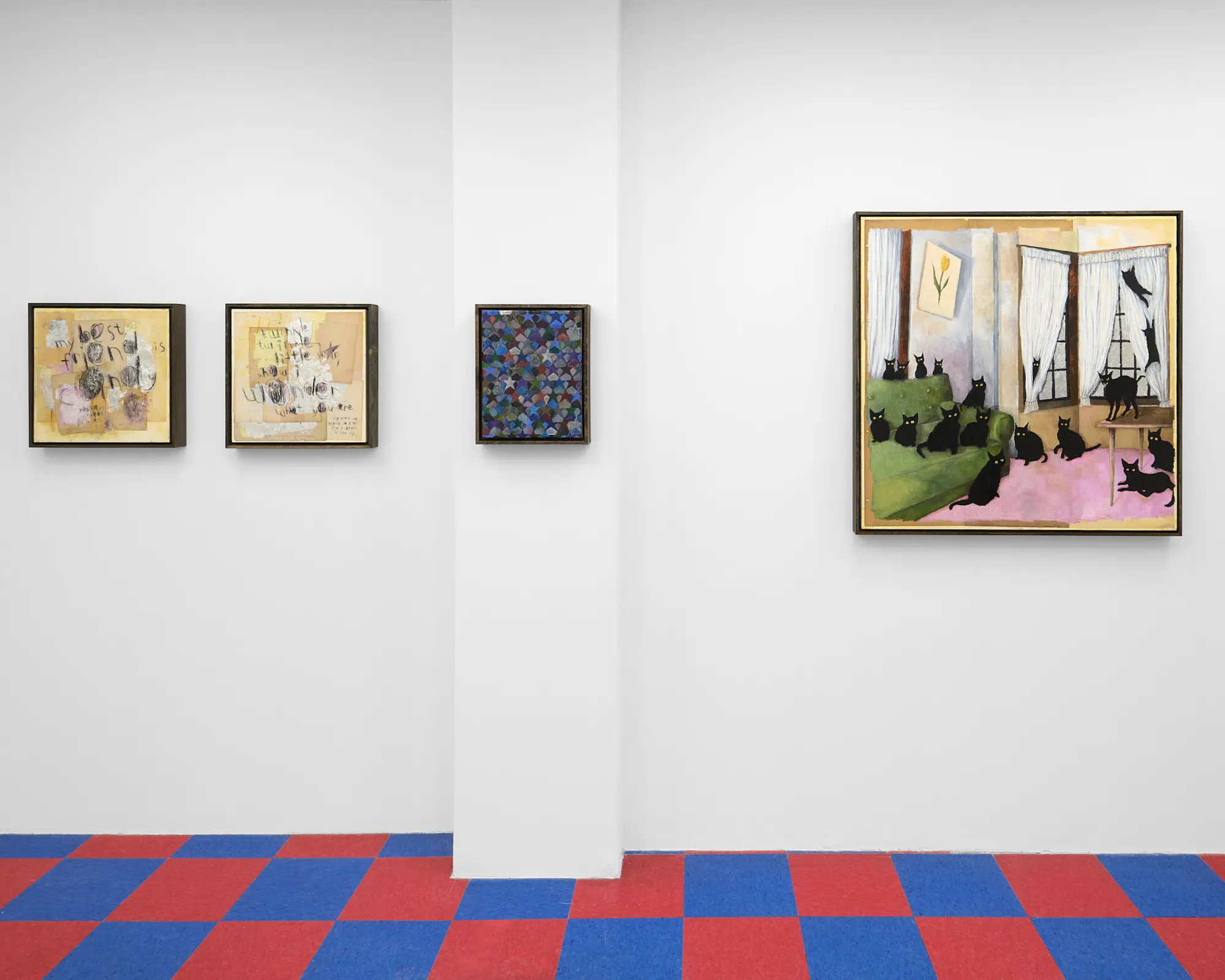 Layered across several canvases are instinctive pencil scribbles—raw, almost childlike marks that cut through the saturated oils. These gestures introduce immediacy and vulnerability, standing in contrast to the richness of the paint. The result is a push and pull between control and abandon, polish and honesty.
